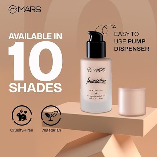 HIGH COVERAGE- The MARS High Coverage Liquid Foundation is designed to provide exceptional coverage, effectively camouflaging imperfections, including blemishes, redness, and uneven skin tone. It creates a flawless canvas for your makeup, giving you a perfected complexion.